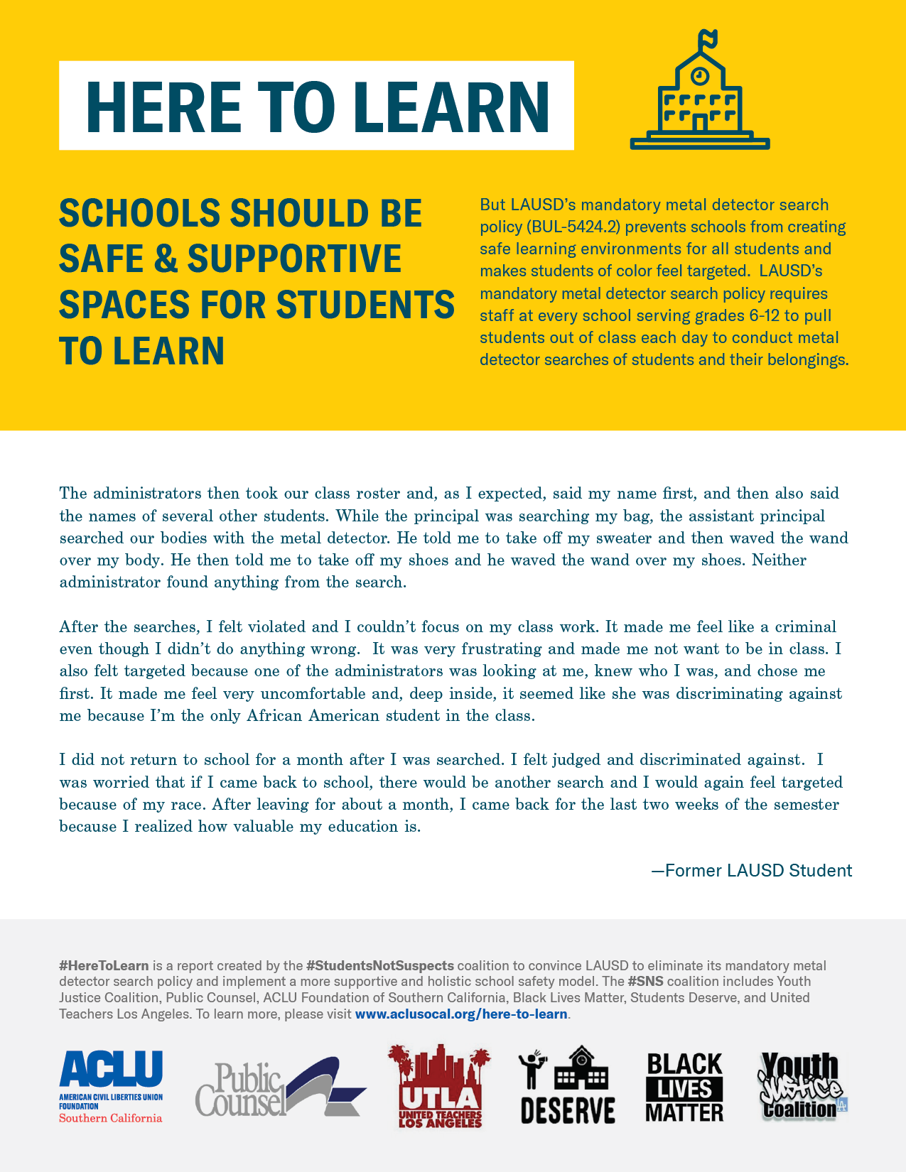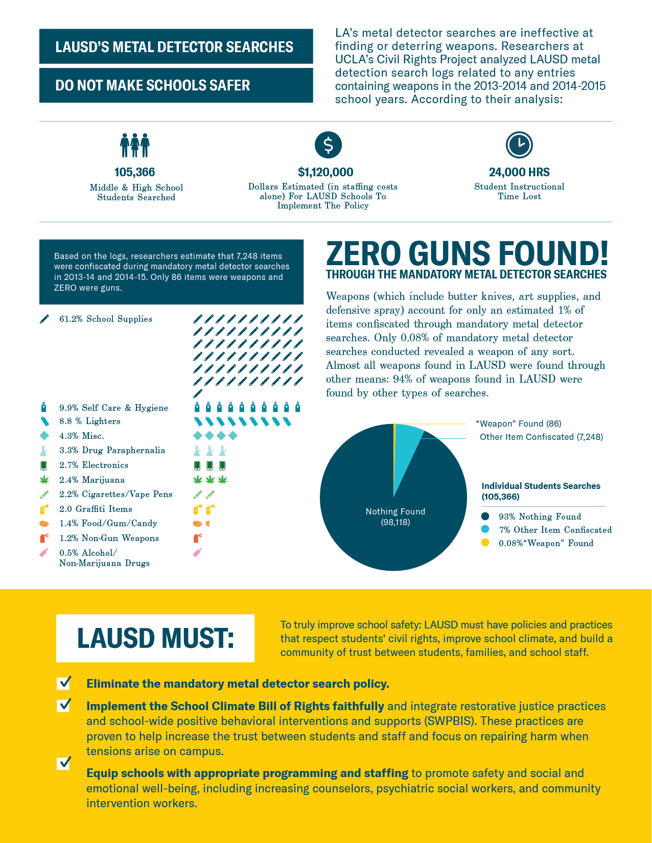 Infographics for ACLU SoCal's Know Your Rights campaign. This fact sheet empowers people with the facts needed to advocate against LAUSD's metal detector search policy that unnecessarily criminalizes students.