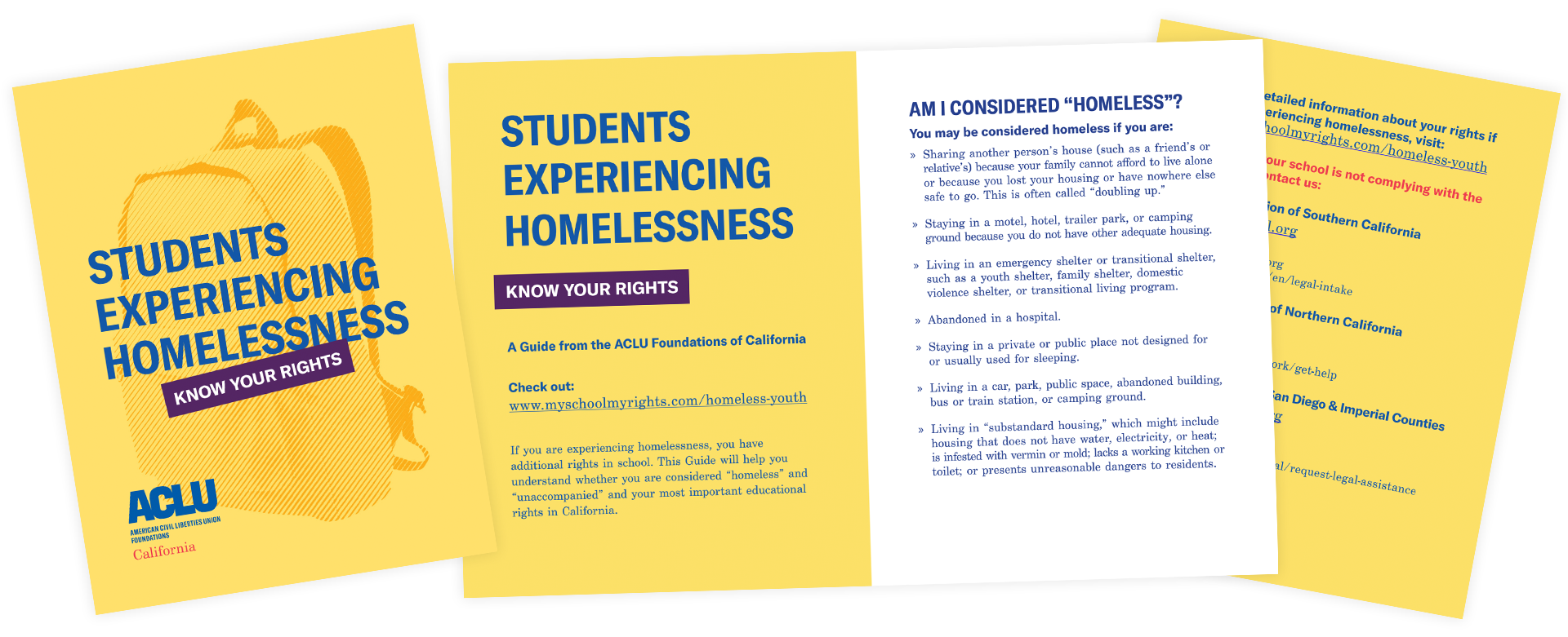 Infographic flyer for the ACLU’s Students Not Suspects awareness campaign and a pamphlet informing students experiencing homelessness of their rights and the resources available to them.